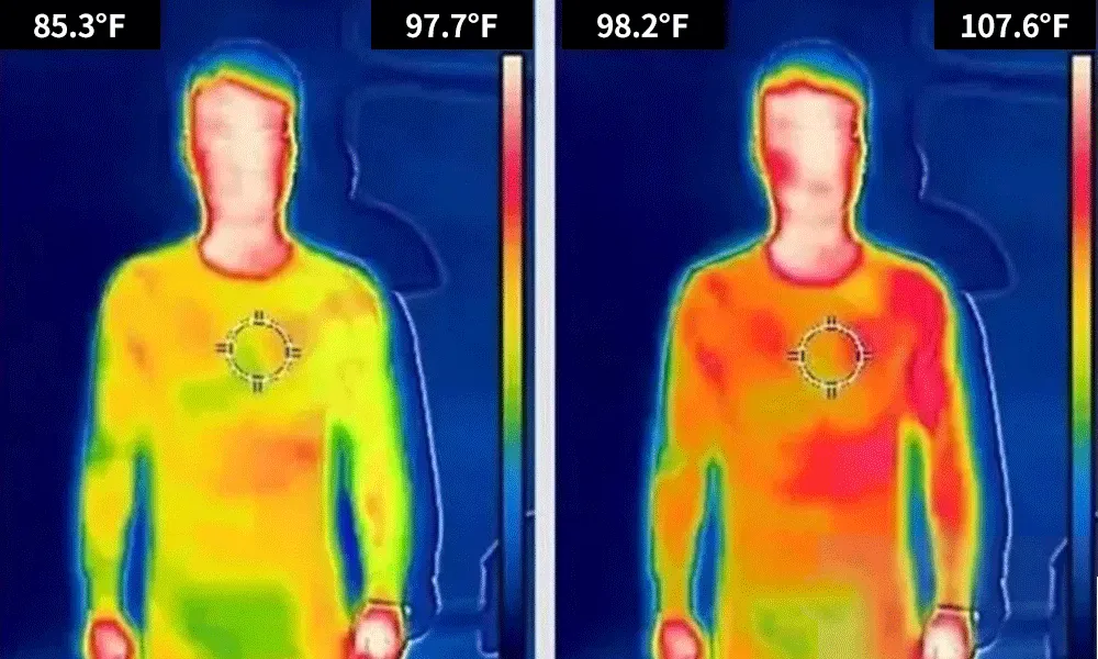 The warmth ceiling of a regular sweatshirt (left) hovers around 97.7 F, providing a perceived temperature of 85.3 F. In contrast, the Hatmeo Lock-Warm sweatshirt (right) boasts a warmth ceiling of up to 107.6 F, maintaining a sustained perceived temperature of 98.2 F.